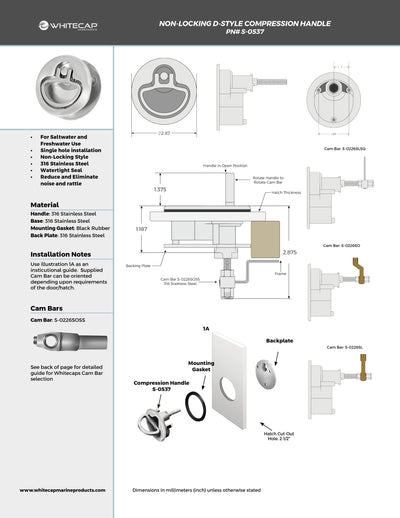 3" 316 Stainless Steel Non-Locking Compression Handle with 1/2" -7/8" Surface Depth